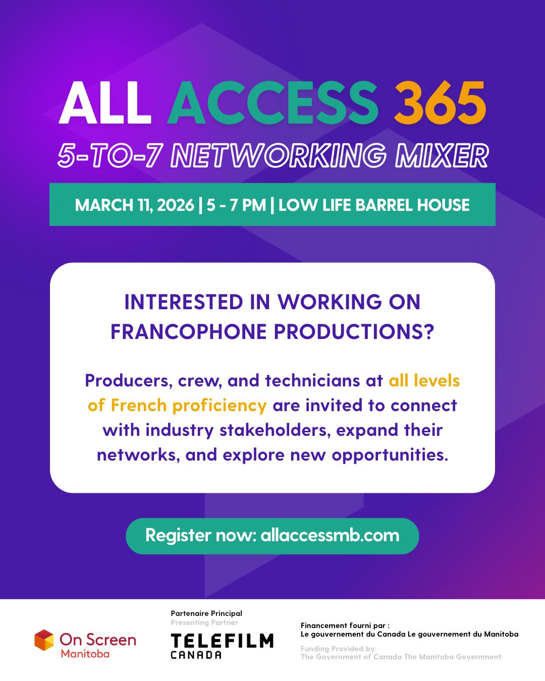 On Screen Manitoba is inviting producers, production companies, and crew who work in French or are developing Francophone projects in Manitoba to attend the All Access 365: Cinq à sept Networking Mixer.