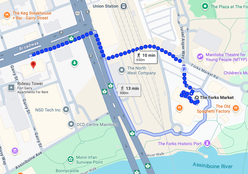 By Car: Paid parking is available at The Forks Parkade (63 Forks Market Road) and at The Fort Garry Hotel (valet, Lower Parkade off Garry Street, or Upper Parkade via ramp on Garry Street).